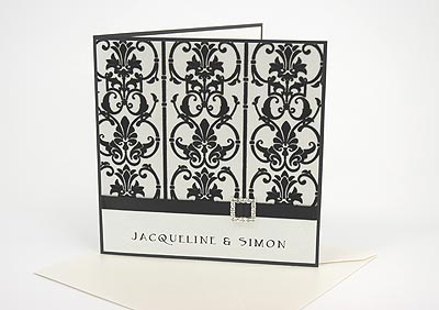 The Elegant design combine black flocked patterned paper with an elegant diamante buckle and subtle off white metallic papers. For the DIY option: The papers are designed to be compatible with most laser and some inkjet printers. We recommend testing by purchasing a sample, to ensure they are compatible. Made by dizzi dezine : We will need to receive your wording, font choice and guestlist before we can go forward with production.