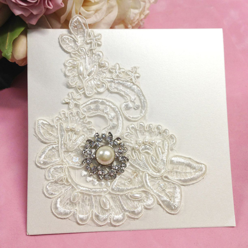 145mm Square folding card with lace motif, pearl & diamante cluster
